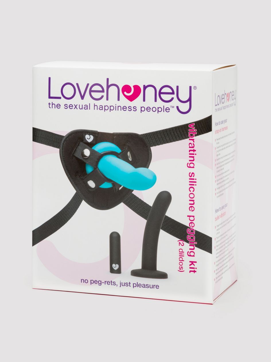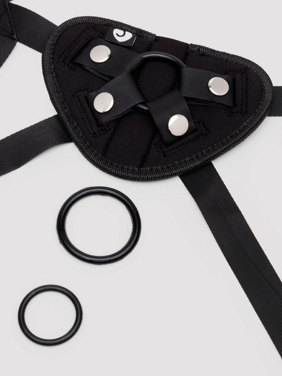Get down and dirty with the perfect kit for exploring the thrills of penetration play. This four-piece kit includes a harness, two non-realistic silicone dildos with suction-cup bases, a removable bullet vibrator, and three O-rings in sizes 1.25 inches for the smooth, black dildo, 1.75 inches for the blue G-spot dildo, and 2 inches for anything larger that tickles your fancy. The silky-soft blue hot-spot-seeking dildo has an insertable length of 6 inches and a circumference of 4 inches, and features a hole at the base to fit the included bullet vibrator to ramp up the thrills. The solid black dildo has an insertable length of 5 inches and a girth of 3 inches. The rechargeable bullet vibrator delivers 3 speeds and 7 patterns for a tailored experience. Please note: if used alone for additional play options, the bullet is for external use only. Not to be used anally. The harness adjusts up to a 58-inch waist and features a convenient front pouch to house the bullet vibrator for that extra blissful buzz. For the best experience, use with a generous splash of water-based lubricant.